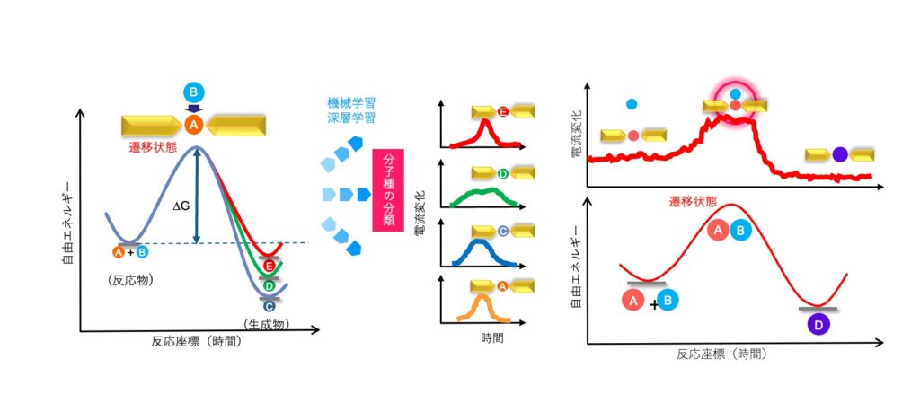 もし、このセレンディピティを意図的に引き起こすことができたら、どうなるでしょうか? 私たちは、この偶然の発見を必然にするための技術を開発しています。それが、「ナノギャップ」を使った「一分子計測」とAIを組み合わせた技術です。この技術を使えば、化学反応の過程で生まれる極微量のDやEを分子レベルで探し出すことができます。